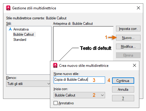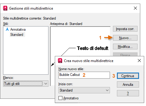 In Gestione stili multidirettrice, fare clic su Nuovo (1), digitare Bubble Callout come il nome del nuovo stile (2), quindi fare clic su Continua (3).