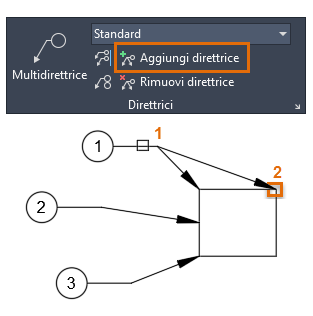 Notare che le punte della freccia e le direttrici vengono regolate con lo spostamento del rettangolo. Per default, le multidirettrici sono associative quando le punte della freccia vengono associate con gli snap ad oggetto.