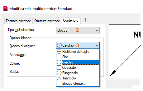 Quindi, fare clic sulla scheda Contenuto (1), modificare il tipo di multidirettrice da Testom a Blocco (2). Per Blocco di origine, scegliere Cerchio (3). Quindi fare clic su OK.