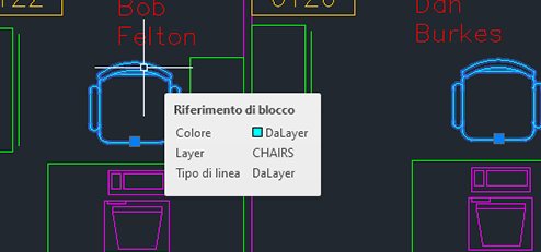 Si supponga di voler modificare queste sedie dal layer CHAIR al layer FURNITURE utilizzando Sposta su layer corrente.