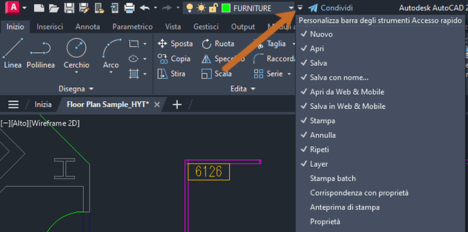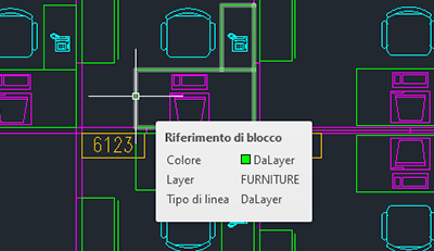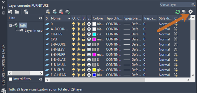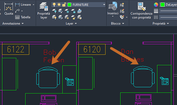 Si supponga di voler rendere corrente il layer FURNITURE. Naturalmente, è possibile semplicemente aprire l'elenco dei layer e scorrere fino al layer FURNITURE. Ma, invece, utilizziamo Rendi corrente per modificare rapidamente il layer corrente.