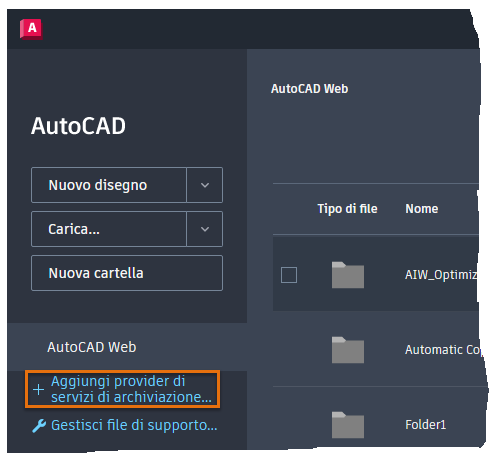 Aggiunta di un provider di servizi di archiviazione cloud all'app AutoCAD per il Web