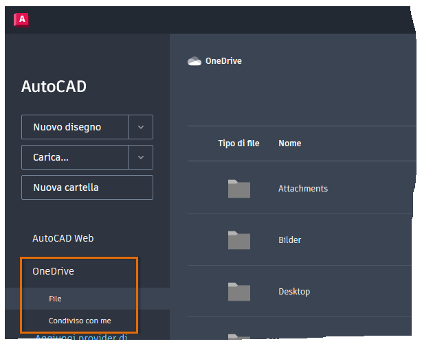 Nota: Per i disegni creati nell'app AutoCAD per il Web e salvati con un provider di servizi di archiviazione cloud di terze parti è possibile accedervi con il desktop di AutoCAD. Potrebbe essere necessario installare un'applicazione aggiuntiva, ad esempio l'app desktop OneDrive o Dropbox per accedere ai file cloud. Una volta installata, è possibile accedere ai file memorizzati nel proprio account di archiviazione cloud come quelli su un'unità locale o di rete. Se si dispone di un prodotto desktop basato su AutoCAD 2020, è possibile sfruttare i vantaggi dei nuovi strumenti di archiviazione cloud di terze parti integrati.