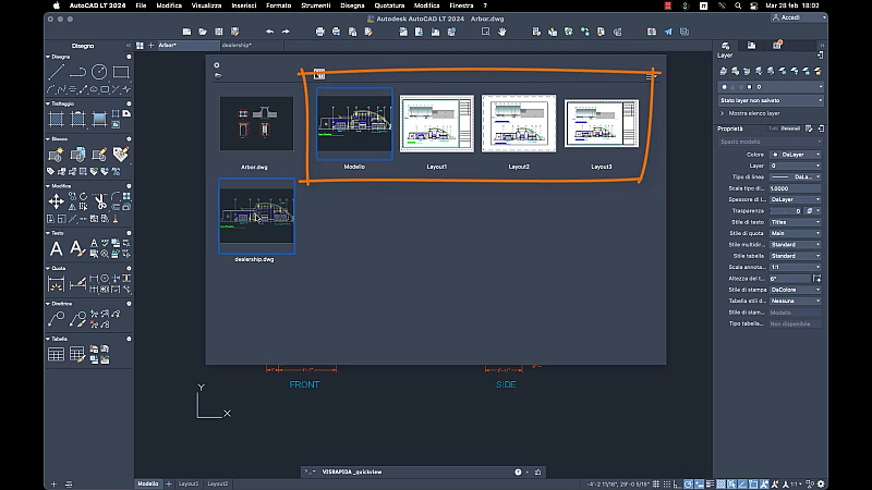 Viene descritto come creare e organizzare oggetti 2D utilizzando i layer, gli strumenti di disegno di base, la modalità orto e lo snap ad oggetto.