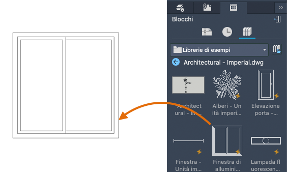 - Nella tavolozza Blocchi, fare doppio clic per posizionare il blocco o trascinarlo per posizionarlo. Quando si fa doppio clic per posizionare il blocco, è possibile utilizzare gli snap ad oggetto per una maggiore precisione.