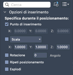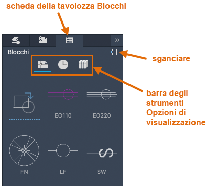 È inoltre possibile individuare un file di disegno e inserirlo come blocco o visualizzare i blocchi nel disegno nella tavolozza Blocchi.