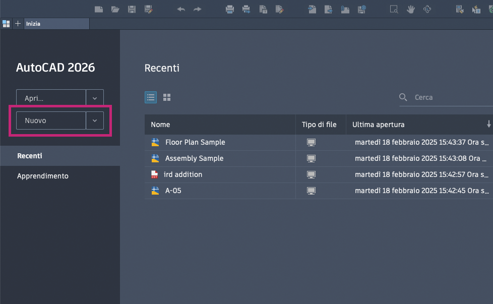 Dopo aver avviato AutoCAD, nella scheda Inizio, fare clic su Nuovo o sul menu a discesa Nuovo per iniziare un nuovo disegno.