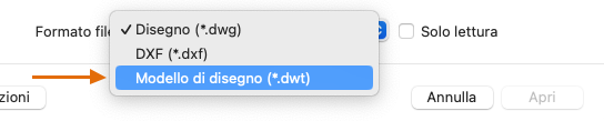 Se si lavora in modo indipendente, è possibile sviluppare file modello di disegno personalizzati in base alle proprie preferenze di lavoro e aggiungere impostazioni man mano che si acquisisce familiarità con altre funzionalità. Per modificare un file modello di disegno esistente, fare clic su Apri, scegliere Modello di disegno (*.dwt) nella finestra di dialogo e scegliere il file modello.