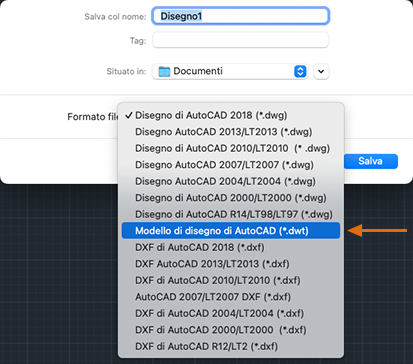 È possibile salvare qualsiasi disegno (.dwg) come file modello di disegno (.dwt). Per creare un nuovo file modello di disegno basato su uno esistente, aprire il file modello di disegno esistente, modificarlo, quindi salvarlo con un nome di file diverso.