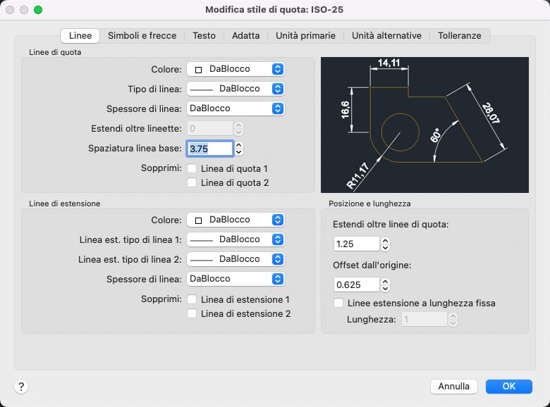 Lo stile di quota di default è denominato Standard (unità imperiali) o ISO-25 (unità metriche). Questo stile viene assegnato a tutte le quote fino a quando non si imposta un altro stile di quota corrente.