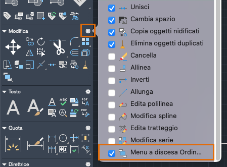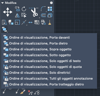 Espandere il menu a discesa per visualizzare le opzioni relative all'ordine di visualizzazione, tra cui l'opzione per portare dietro tutti i tratteggi, quella per portare avanti gli oggetti selezionati e così via.