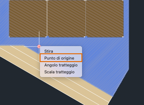 Se è necessario allineare il modello in un tratteggio, ad esempio per le tavole del pavimento della veranda illustrate sopra, passare il cursore sul grip di origine del tratteggio e selezionare Punto di origine per specificare un punto di allineamento.