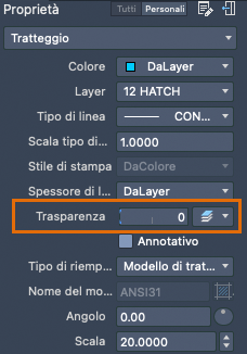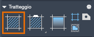 Quando si avvia il comando TRATTEGGIO, viene visualizzato temporaneamente il visor Tratteggio. In questo visor sono disponibili modelli di tratteggio imperiali e ISO conformi agli standard di settore, nonché numerose opzioni specifiche.