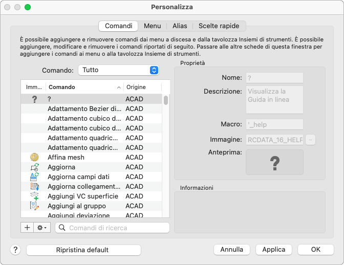 Visualizza tutti i comandi standard e personalizzati disponibili.