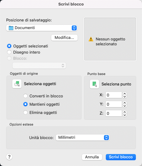 Seleziona gli oggetti da salvare come file. Specificare un punto base e selezionare gli oggetti sotto.