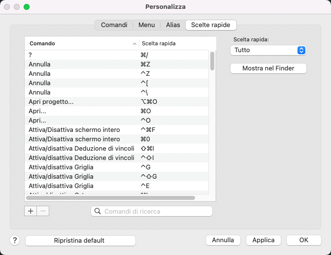 - È possibile visualizzare tutti i tasti di scelta rapida o solo quelli personalizzati.