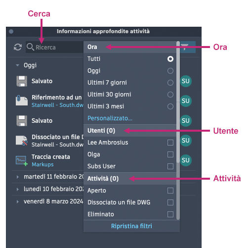 Per cancellare un filtro, selezionare le opzioni Tutti, Tutti gli utenti o Tutte le attività dai menu a discesa del filtro.