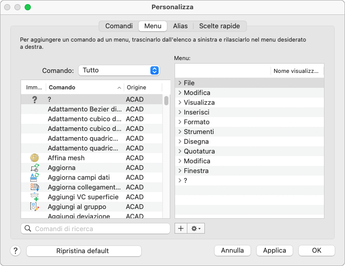 Trascinare il comando nella posizione desiderata nel menu e rilasciarlo. La posizione del comando è indicata dalla barra orizzontale. Se si posiziona il cursore su un menu o un sottomenu durante il trascinamento di un comando, il menu o il sottomenu si espanderà dopo un breve intervallo.