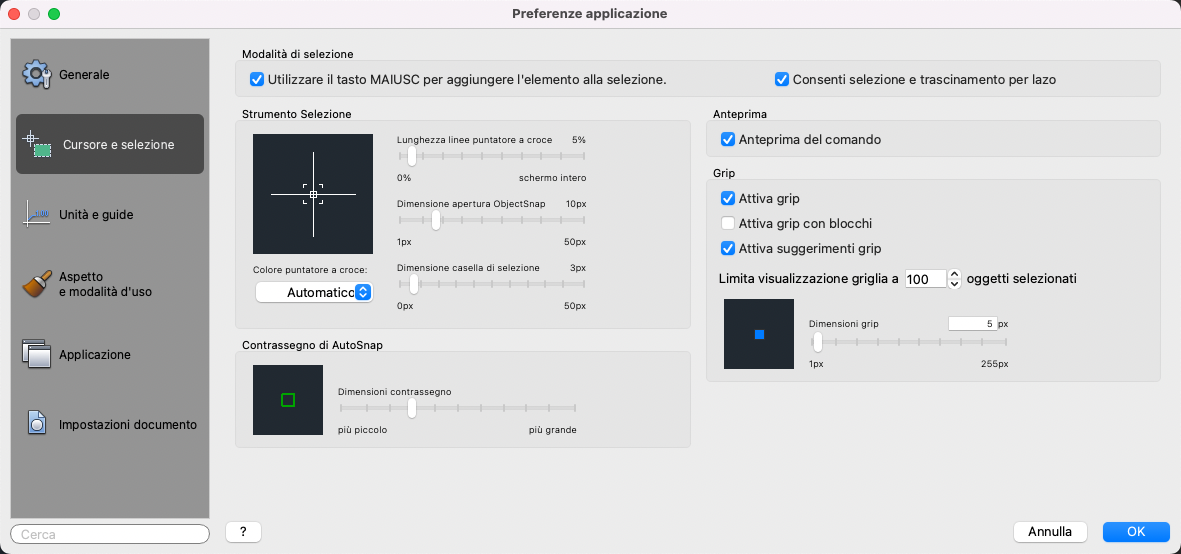 Controlla il colore del puntatore a croce, dell'apertura ObjectSnap e del riquadro di selezione nell'area di disegno. Il colore di default è Automatico.