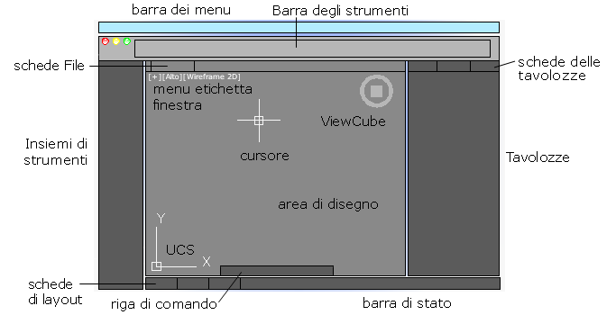 Nell'interfaccia utente vengono visualizzate le tavolozze e le barre intorno all'area di disegno. Inoltre, nell'area di disegno vengono visualizzati diversi controlli.