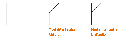 Per default, gli oggetti selezionati per definire una cima o uno smusso vengono tagliati o estesi fino alla linea angolata risultante. È possibile utilizzare l'opzione Taglia per specificare se gli oggetti selezionati vengono modificati o lasciati invariati.