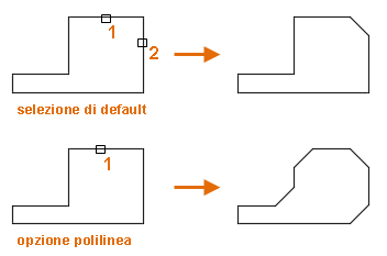 Se l'opzione Taglia è attivata e sono selezionati due segmenti di linea di una polilinea, la cima o lo smusso aggiunto viene unito con la polilinea come nuovo segmento di linea.