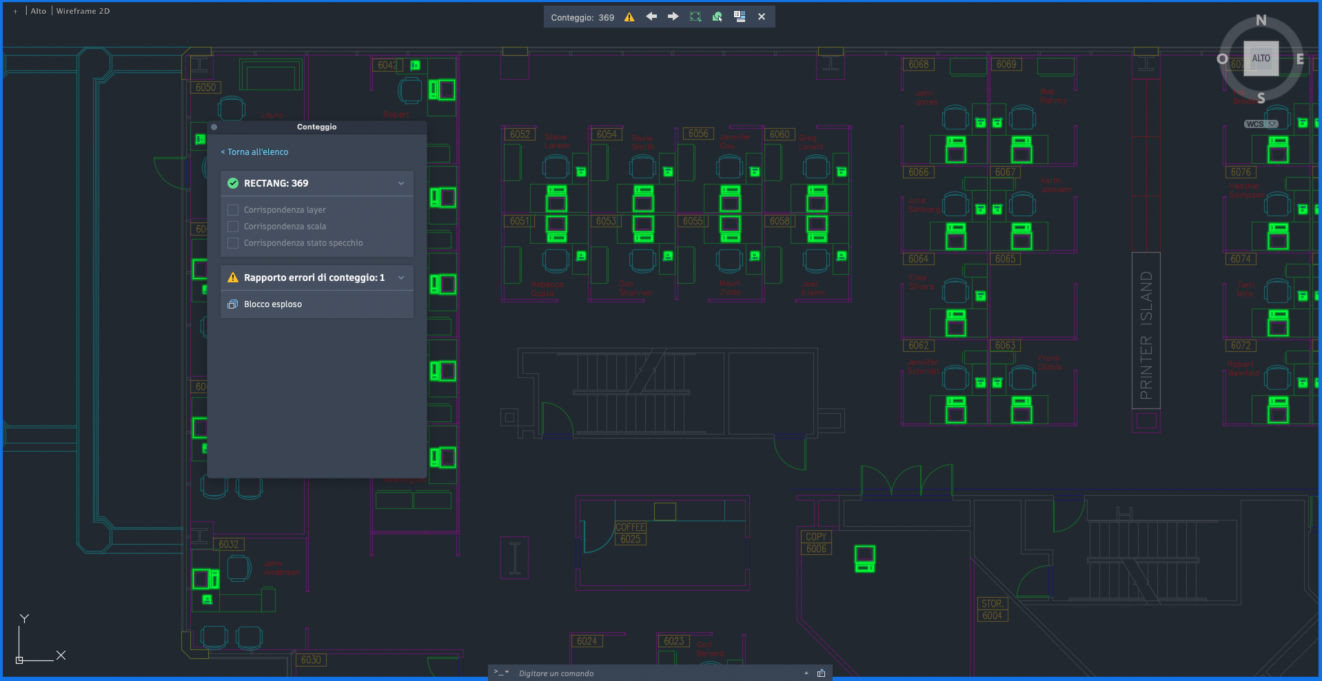 La tavolozza Conteggio visualizza i nomi dei blocchi e il conteggio corrispondente di ogni blocco. In un conteggio attivo, nella tavolozza Conteggio vengono visualizzati i dettagli del conteggio, incluso l'eventuale rapporto sugli errori. Il rapporto elenca gli errori di conteggio, ad esempio oggetti sovrapposti, esplosi o rinominati.