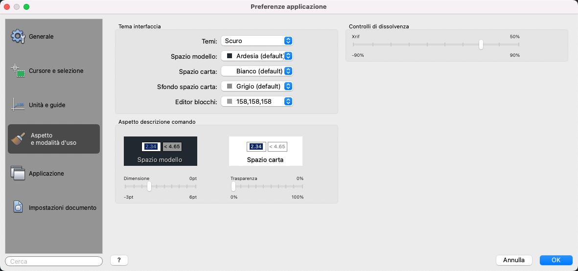 Controlla il tema da applicare agli elementi quali la barra di stato, tavolozze e le finestre di disegno. È possibile scegliere un tema Chiaro o Scuro.