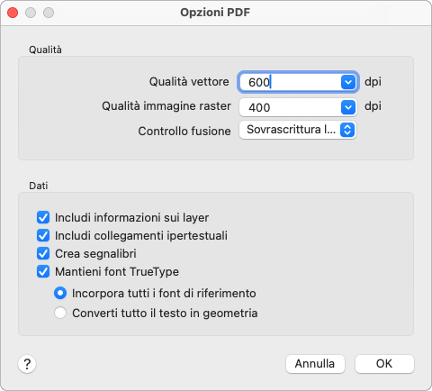 - Incorpora i font TrueType nel file PDF affinché non debbano essere necessariamente disponibili nel visualizzatore PDF. Se non si seleziona questa opzione, il visualizzatore PDF utilizza font di sostituzione.
