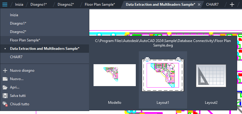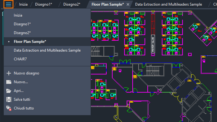Utilizzare il nuovo menu della scheda File per passare da un disegno all'altro, creare o aprire un disegno, salvare tutti i disegni, chiudere tutti i disegni e altro ancora.