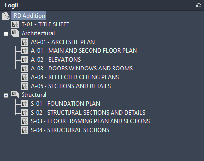 - I sottogruppi di fogli sono spesso associati ad una disciplina, quale l'architettura o la progettazione meccanica. È ad esempio possibile utilizzare rispettivamente i sottogruppi Strutturale in architettura ed Elementi di fissaggio standard in progettazione meccanica. In alcuni casi, può essere utile creare sottogruppi associati ad uno stato di revisione o completamento. È possibile nidificare i sottogruppi in altri sottogruppi, in base alle necessità. Dopo aver creato o importato fogli o sottogruppi, è possibile riordinarli trascinandoli nella struttura.