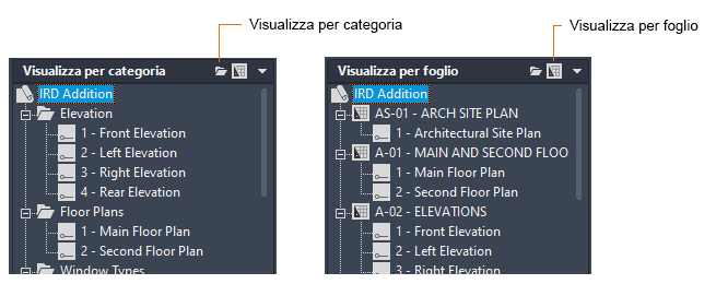 - Le categorie vista sono spesso associate ad una funzione. È ad esempio possibile utilizzare rispettivamente le categorie vista Prospetti in architettura e Viste esplose in progettazione meccanica. È possibile visualizzare le viste in base alla categoria oppure al foglio su cui si trovano. Le categorie possono essere nidificate in altre categorie in base alle necessità. Per spostare una vista in una categoria diversa, trascinarla nella struttura oppure utilizzare l'opzione del menu di scelta rapida Imposta categoria.