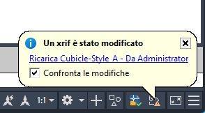 Per default, se un file di riferimento è stato modificato, viene visualizzato un messaggio di notifica bolla vicino all'icona dell'xrif nell'angolo inferiore destro della finestra dell'applicazione, ossia sulla barra di stato. Fare clic sul collegamento all'interno della bolla per ricaricare tutti gli xrif modificati.