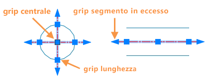 È possibile modificare linee d'asse e centri con i grip. Posizionando il cursore sui grip vengono visualizzate le quote dinamiche della linea di estensione. Con i grip multifunzione centrali di un centro, è possibile scegliere le operazioni seguenti:
