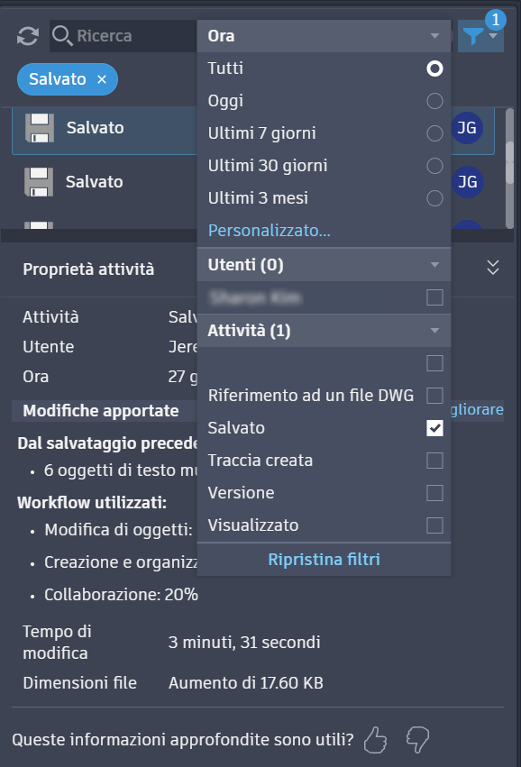 Selezionando Salvato nel filtro delle attività, è possibile isolare l'attività della versione. Per filtrare ulteriormente i dati, utilizzare i filtri Ora e Utenti.