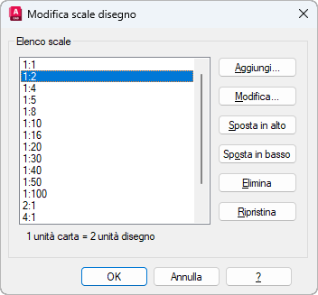 Elimina tutte le scale personalizzate e quelle inutilizzate e ripristina l'elenco di scale di default definito nella finestra di dialogo Elenco scale di default.