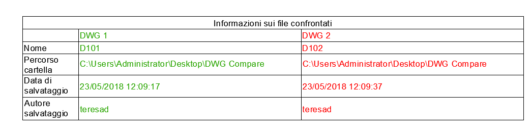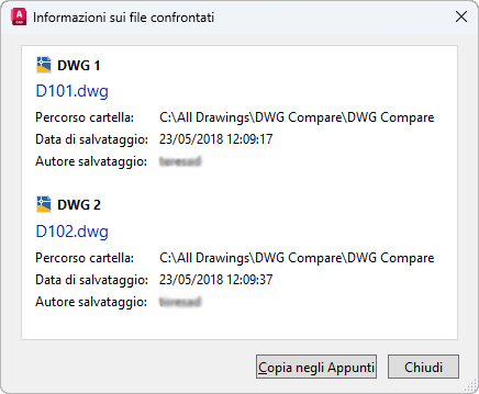 Questo comando apre una finestra di dialogo che visualizza informazioni sui file di disegno confrontati. Sono disponibili opzioni per creare un oggetto tabella con le informazioni presenti o per copiare le informazioni negli Appunti.