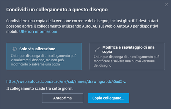 È possibile condividere un collegamento ad una copia del disegno corrente da visualizzare o modificare nell'app AutoCAD per il Web (web.autocad.com) o per i dispositivi mobili. La copia del disegno include tutti i riferimenti esterni e le immagini.