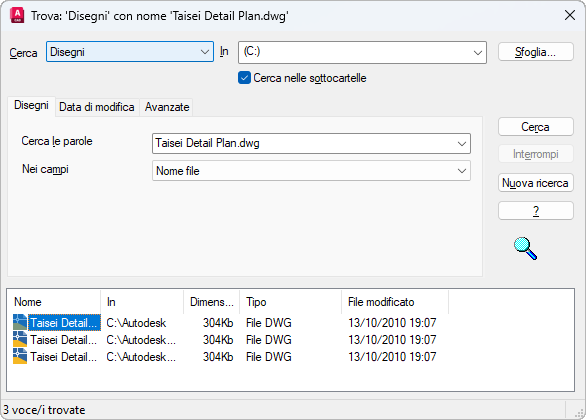 Specifica il nome del disegno, del blocco, del layer, dell'xrif o di un altro tipo di contenuto di cui si desidera effettuare la ricerca.