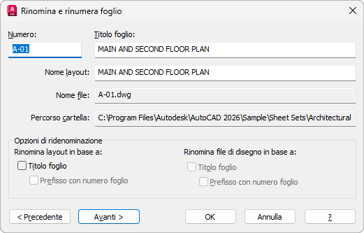 Quando selezionata, questa opzione consente di modificare il nome del file di disegno in base al titolo del foglio.