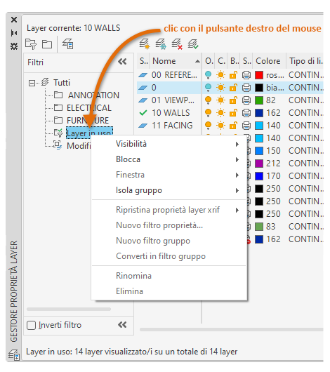 Imposta il layer selezionato come layer corrente. I nuovi oggetti vengono creati automaticamente sul layer corrente. (variabile di sistema CLAYER)