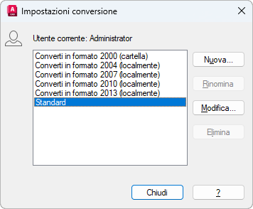 Visualizza la finestra di dialogo Modifica impostazione di conversione, in cui è possibile specificare opzioni per la conversione del disegno selezionato.
