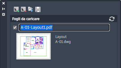 Per default, il nome del file PDF è <nome disegno>-<nome layout>.PDF. Fare clic sul nome del file da modificare in modo dinamico.