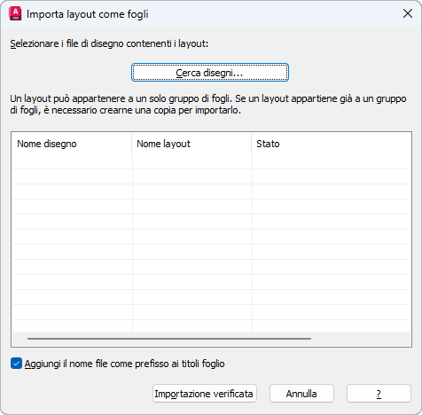 Elenca tutti i layout disponibili nel file di disegno specificato. Fare clic su una casella di controllo per selezionare un layout.