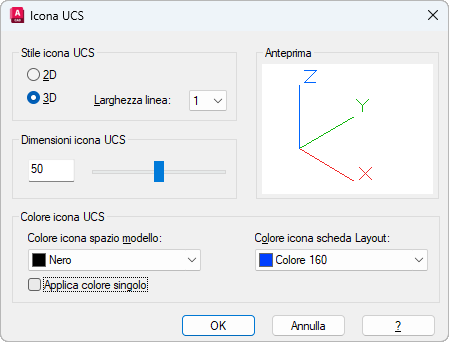 Specifica la visualizzazione dell'icona UCS 2D o 3D e il relativo aspetto.