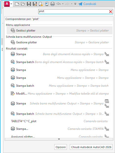 Il campo per la ricerca di comandi viene visualizzato al di sopra del menu dell'applicazione. I risultati della ricerca possono includere comandi di menu, descrizioni comandi di base e stringhe di testo della riga di comando. È possibile immettere un termine di ricerca in qualsiasi lingua. I risultati sono validi per l'area di lavoro corrente.