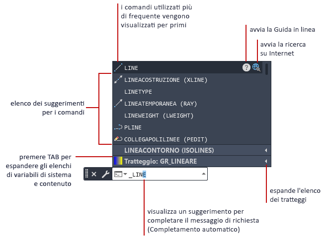 Non appena si immettono le prime lettere di un comando nella finestra dei comandi o nella casella di input dinamico, viene visualizzato un elenco dei comandi suggeriti. Per default, l'elenco presenta le seguenti caratteristiche: