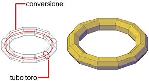 I tori mesh hanno due raggi: Un valore definisce il tubo, mentre l'altro valore definisce il percorso, ovvero la distanza tra il centro del toro e il centro del tubo. Per default, un toro viene creato parallelo al piano XY dell'UCS corrente, che ne rappresenta anche la bisettrice.