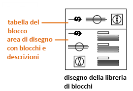 È possibile organizzare un insieme di definizioni di blocchi correlate creando i blocchi nello stesso file di disegno. I file di disegno utilizzati in questo modo vengono detti librerie di blocchi o di simboli. Queste definizioni dei blocchi possono essere inserite singolarmente in qualunque disegno. I disegni delle librerie di blocchi non sono diversi dagli altri file di disegno di AutoCAD ad eccezione del modo in cui vengono utilizzati.
