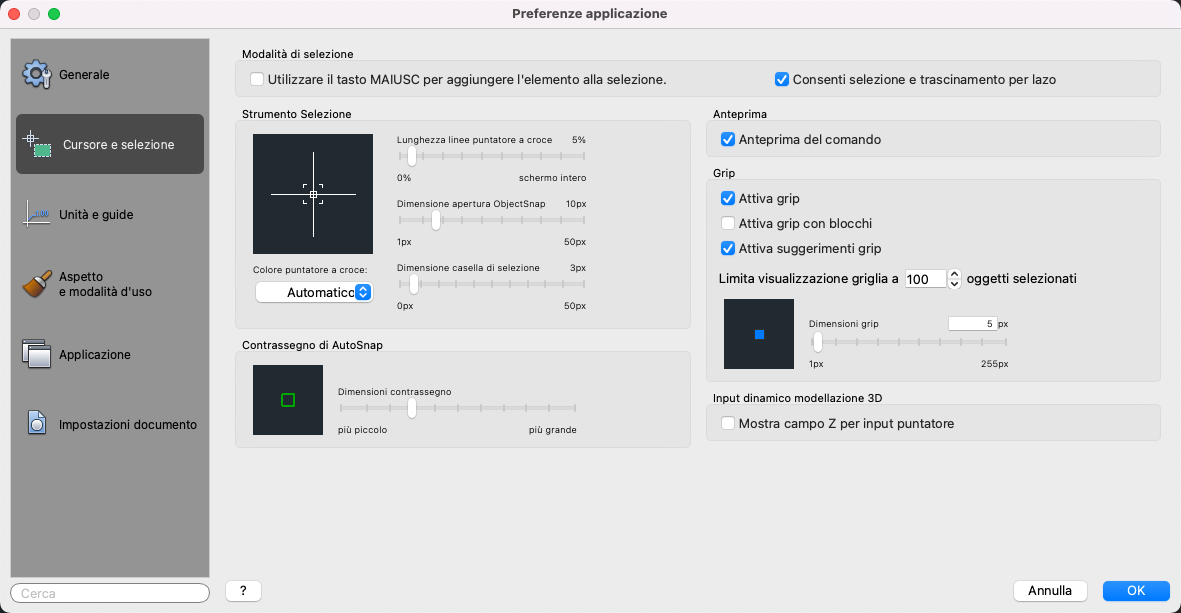 Controlla il colore del puntatore a croce, dell'apertura ObjectSnap e del riquadro di selezione nell'area di disegno. Il colore di default è Automatico.